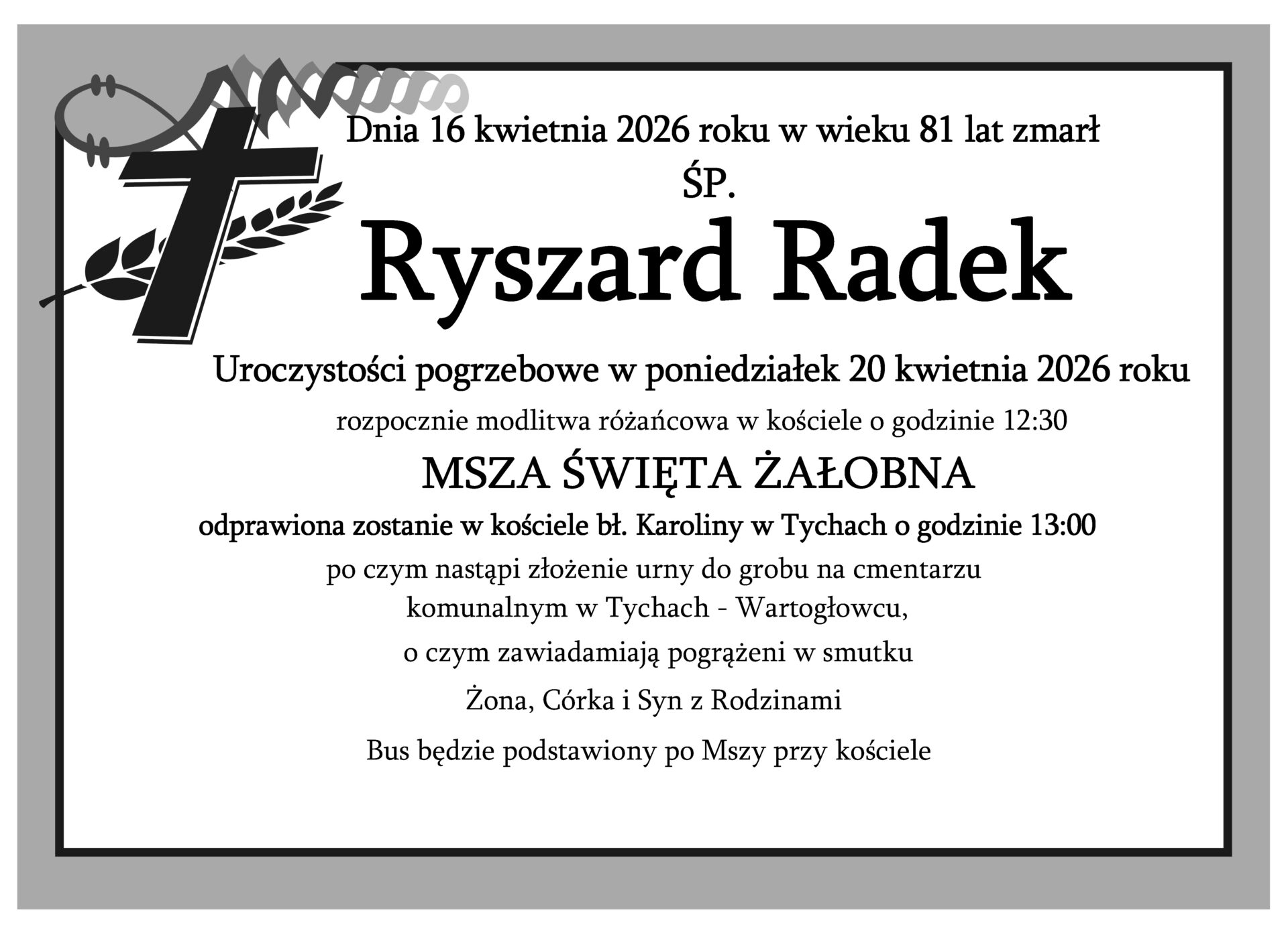 Z przykrością informujemy, że w czwartek, 16 kwietnia 2026 roku, przeżywszy 81 lat,